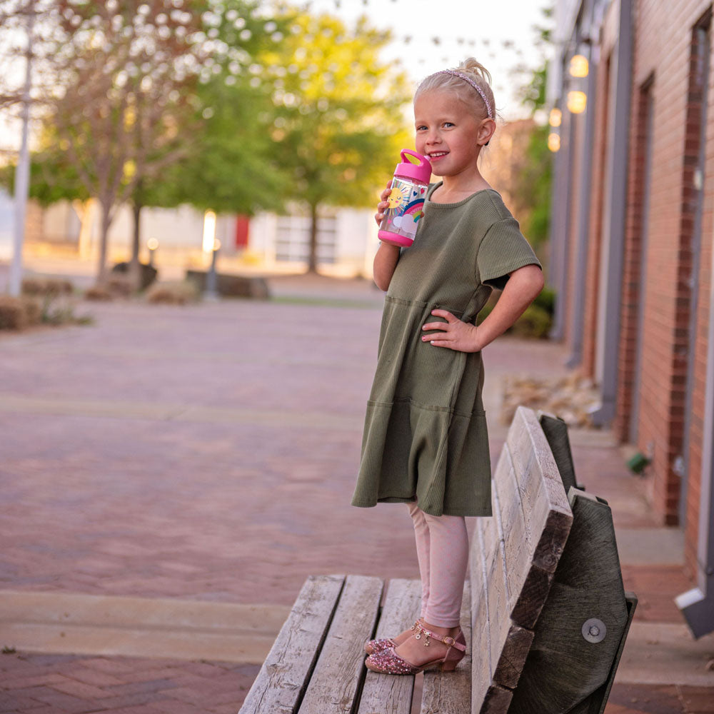 Kids and parents will “flip out” over Stephen Joseph Flip Top Bottles. Right sized for little hands with an easy to use flip top spout, this bottle is perfect for the transition away from sippy cups, but can also be used as an everyday bottle for school and play. Fits in all mesh side pockets on any Stephen Joseph backpacks, luggage and bags. Don’t have a side pocket or bottle holder? No problem, the lid is designed so that it can be easily attached to bags, strollers, or belt loops with a clip or carabineer. Body, lid and straw come apart for easy wash and cleaning.