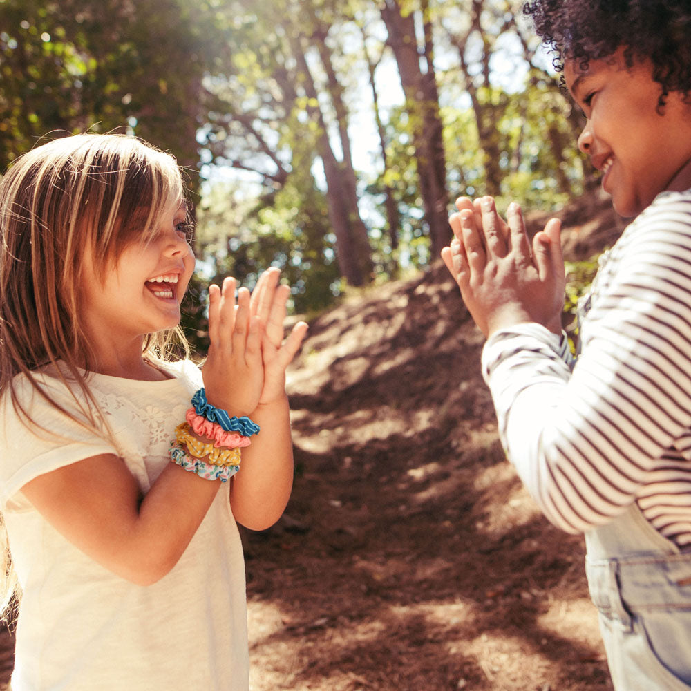 Our trendy and sweet slim scrunchies come in a set of four funky patterns that are guaranteed to bring a big smile to your little one’s face! The scrunchies hold up hair securely and are gentle for every tender-headed little one. When they are not in hair, they can also be seen as darling bracelets!